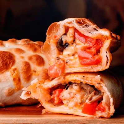 | Pollo, champiñones, cebolla, morrón y condimentos. |