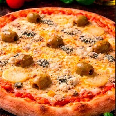 | Muzzarella, roquefort, jamón, salsa de tomate y aceitunas. |